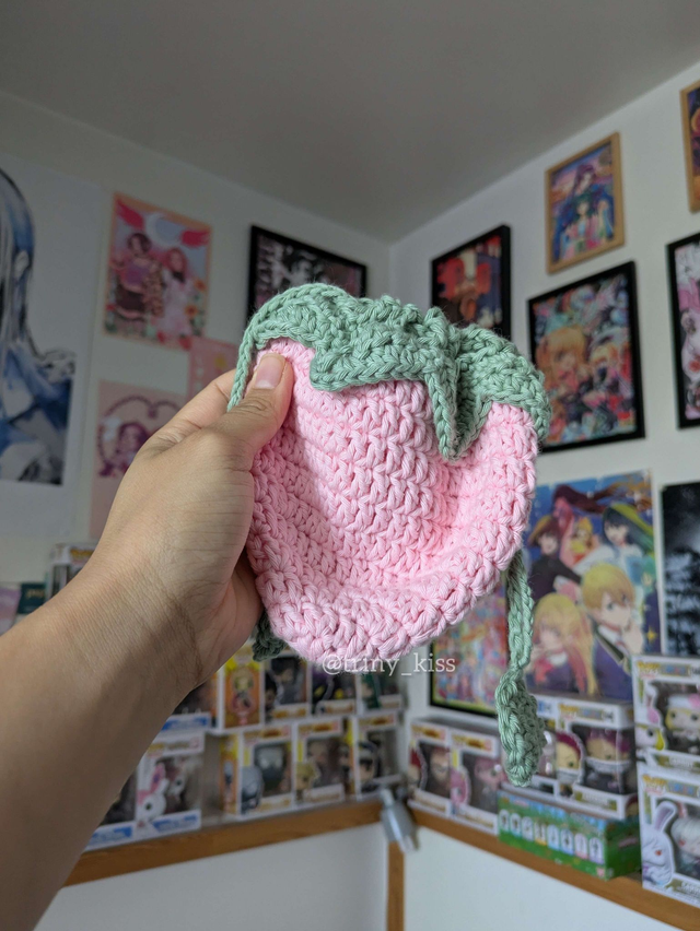 Bonjour ! Voici un amigurumi d'un pochon en forme de fraise en crochet fait main.