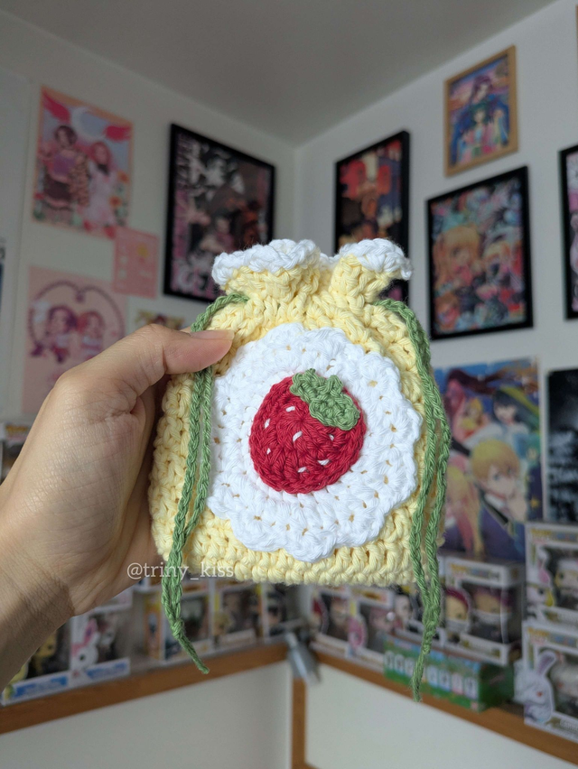 Bonjour ! Voici un amigurumi d'un pochon fraise en crochet fait main.